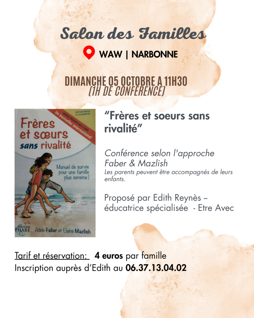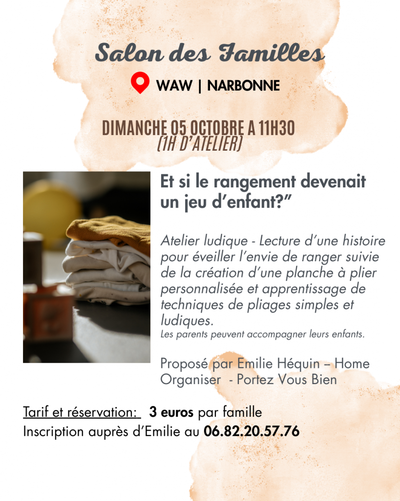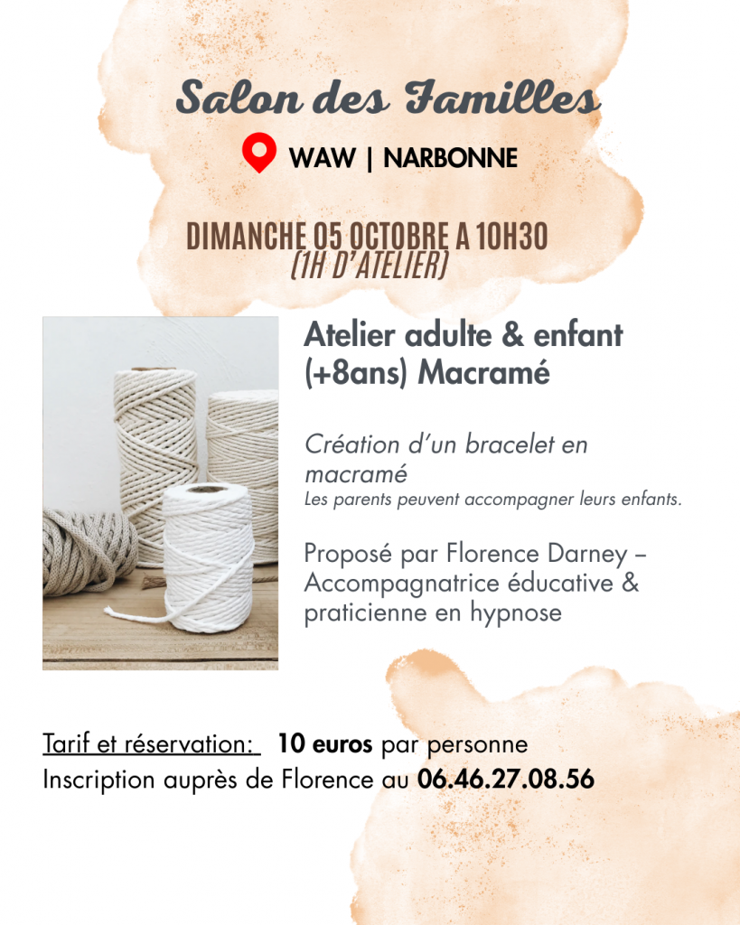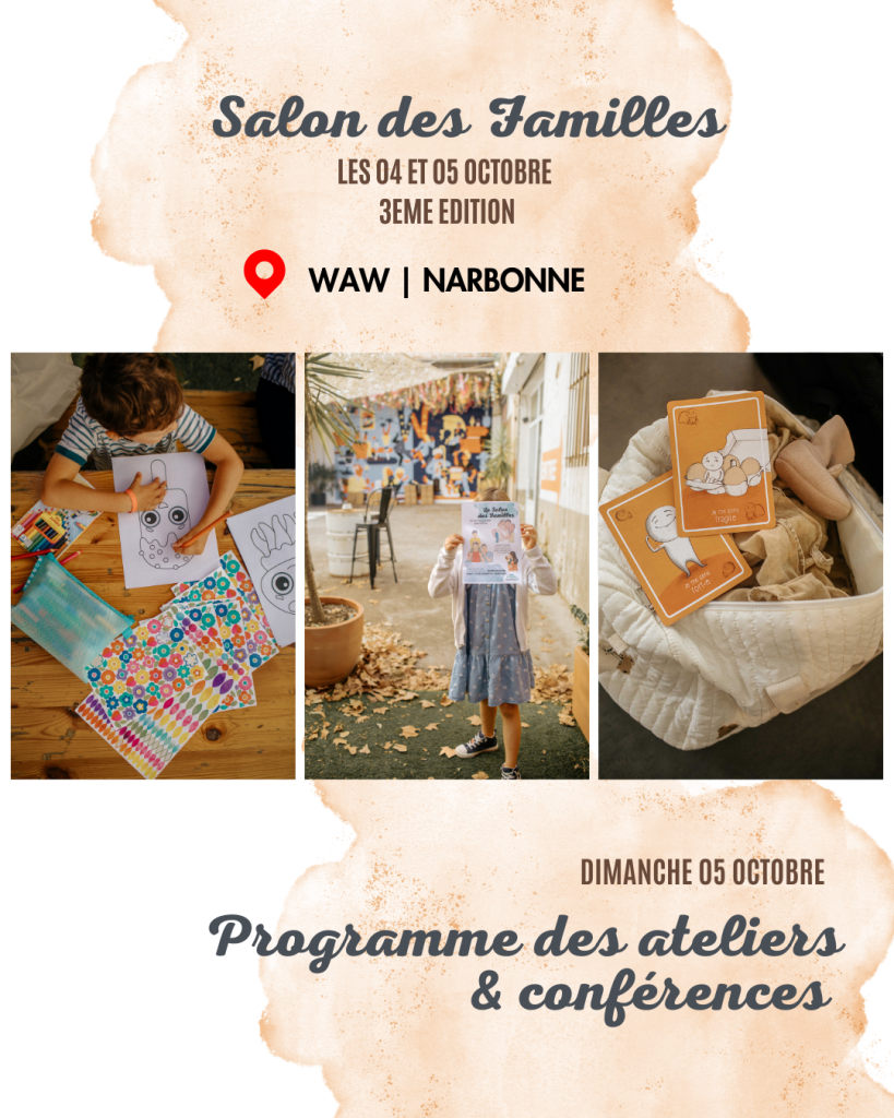 En ce deuxième jour de Salon des Familles retrouvez : l’atelier Parlons maternité autour de la grossesse, de la naissance et du post-partum avec @les_mains_sur_le_ventre , un atelier de création de bracelet en macramé animé par @florence.darney , la conférence « Frères et soeurs sans rivalité » par Edith Reynes, l’atelier pour enfants « et si le rangement devenait un jeu d’enfant? » proposé par @portezvousbien11 , le café papote « Faut-il arrêter de partager les photos de nos enfants sur les réseaux sociaux? » animé par @ilithyia.photographe et une séance d’hypnose collective proposée par @florence.darney .