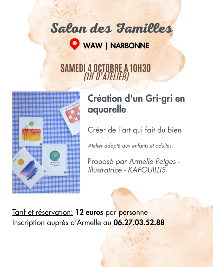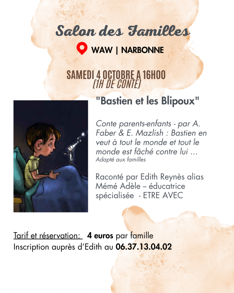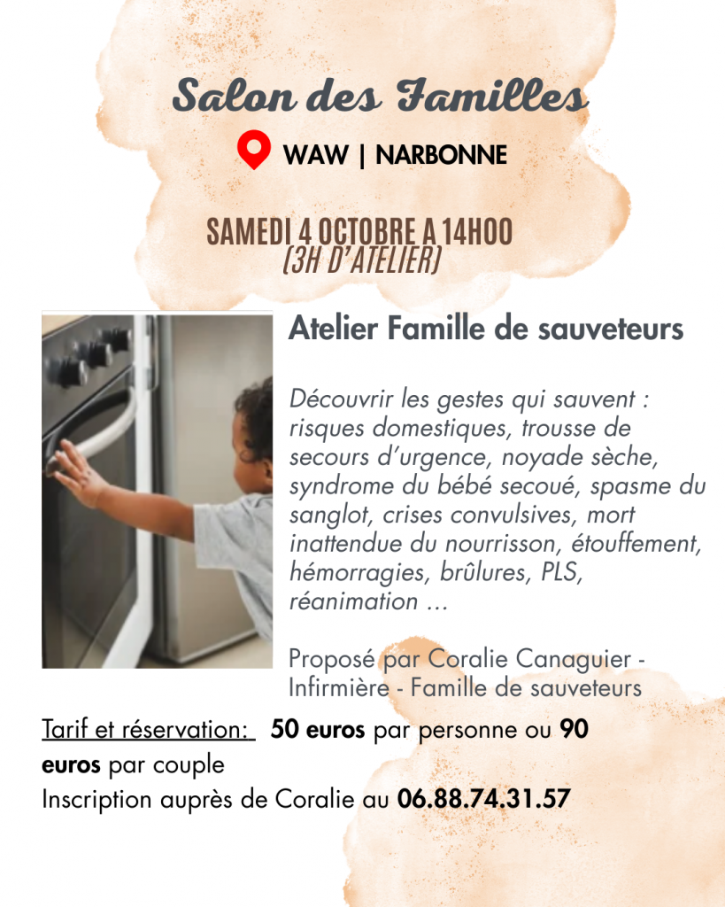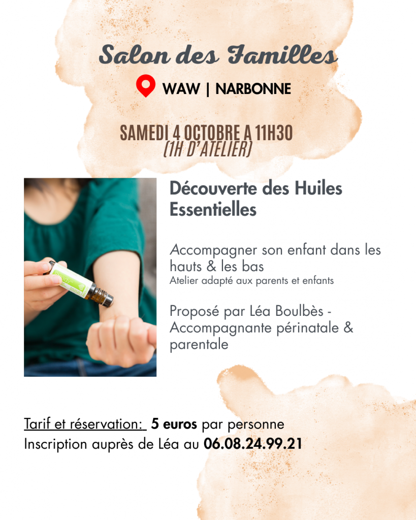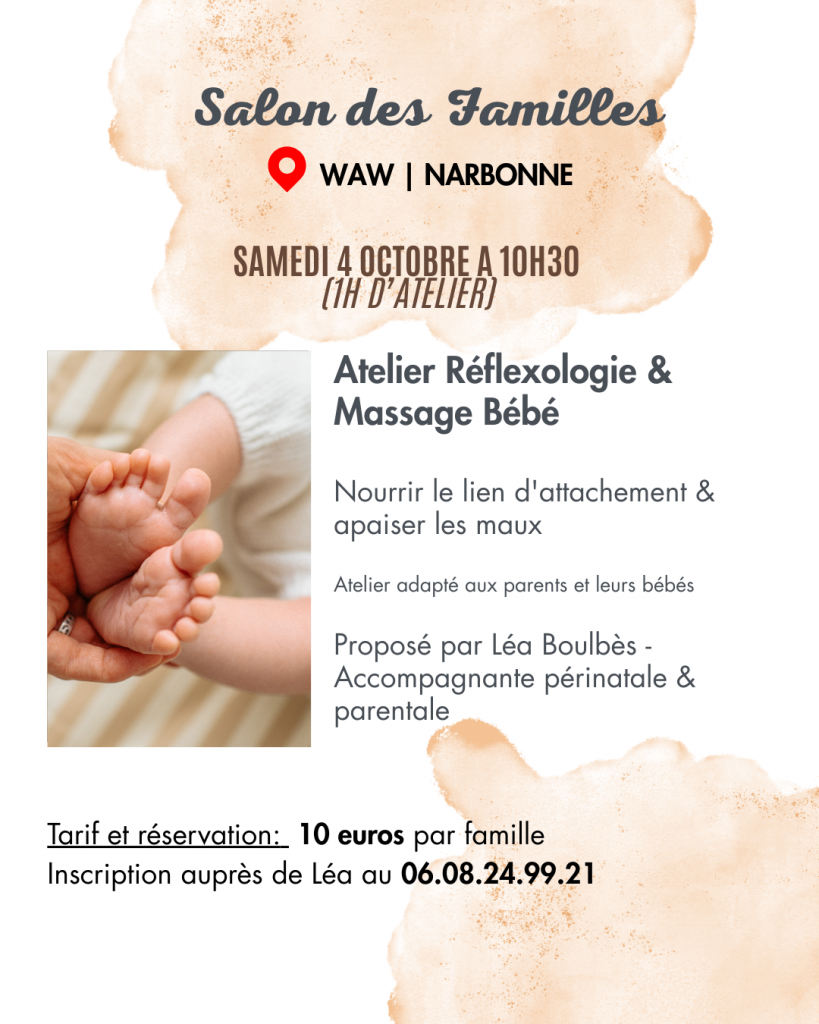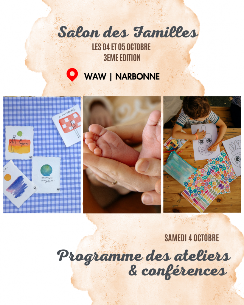 En ce premier jour de Salon des Familles retrouvez : l’atelier aquarelle de @kafouillis , l’atelier réflexologie bébé avec @lea_boulbes_ , l’atelier huiles essentielles kit enfant avec Léa, l’atelier @familledesauveteurs11 pour découvrir les gestes qui sauvent, l’atelier Mon projet de naissance pour bien préparer l’arrivée de bébé avec @les_mains_sur_le_ventre , la lecture du conte « Bastien et les Blipoux » selon l’approche Faber et Mazlish raconté par Mémé Adèle.